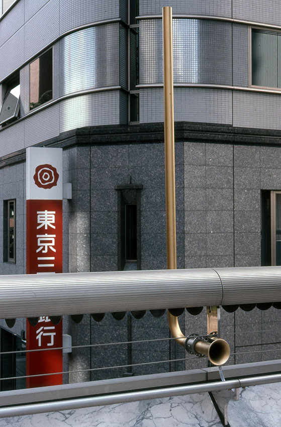 その道具とは伝声管のこと。船舶の艦橋と機関室のコミュニケーション等に使われたものだ。管の片側にだけラッパがついた構造で、片端は、空に向かってそのまま切れている。本来の機能から独立し、その形骸が静かに街にまぎれているわけである。