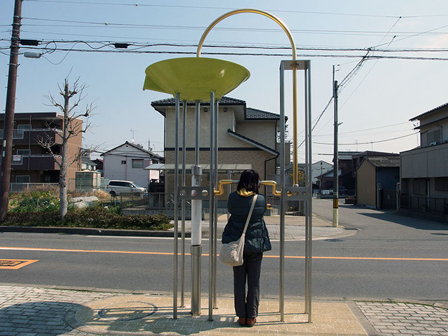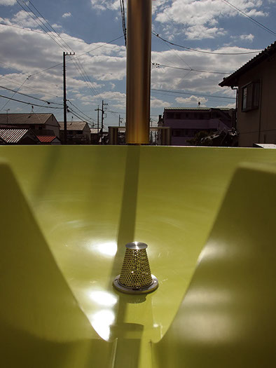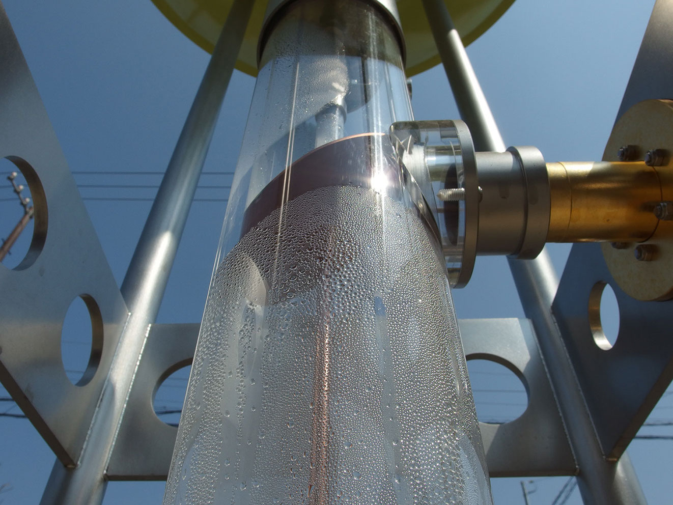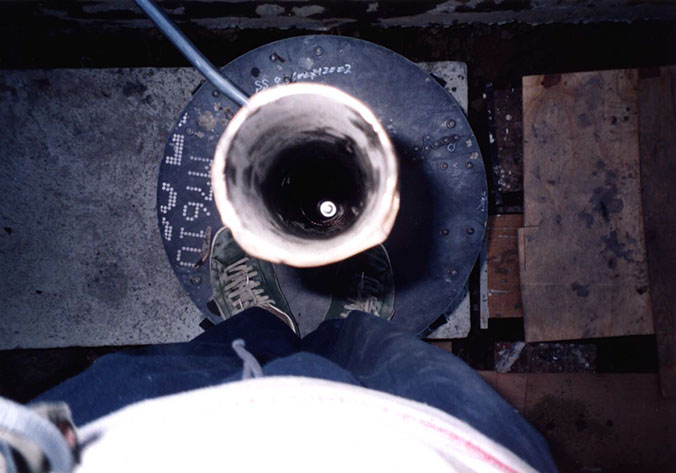 天に向けて設置されたパラボラ集音器の焦点から音を導くパイプと足もとに掘られた井戸の地下水面に向けられたパイプが、フレームで支持され、それぞれの開口端にはイヤーパッドが対向して取り付けてある。鑑賞者は、そこに左右の耳を挟み込むことで、上空と地球の中心を結ぶ線上に自らの知覚を挿入する事に成る。また、雨の日、パラボラは、雨水を集めることにもなり、その水が直接地下水面に滴下する為の仕組も持たせてある。主に聴覚を頼りに世界とつながる為の装置でもある。