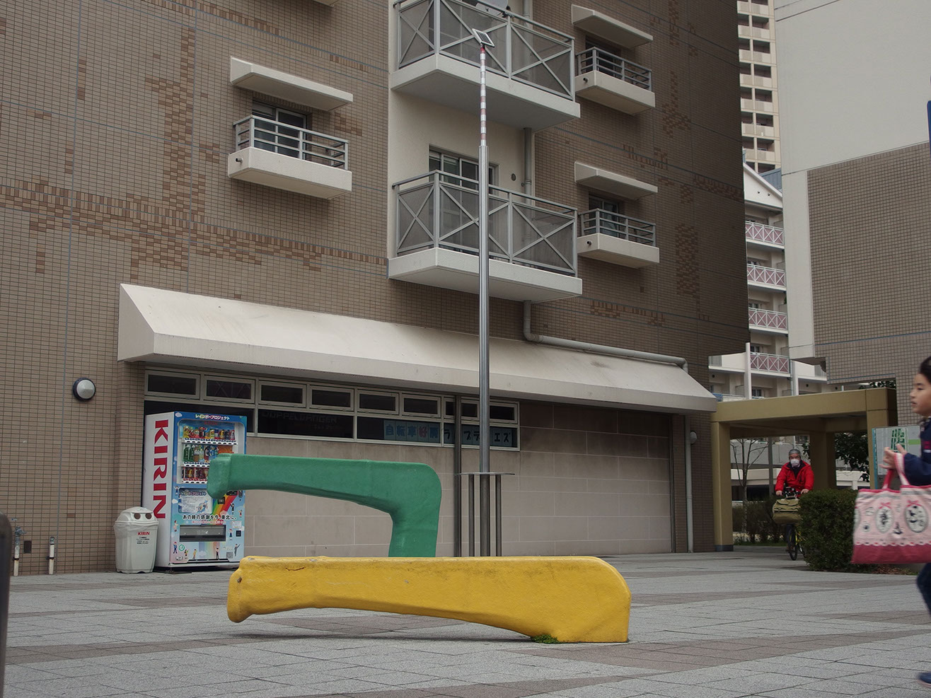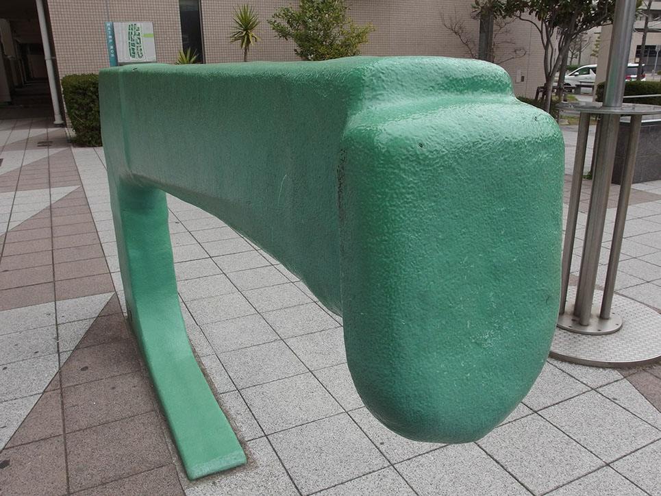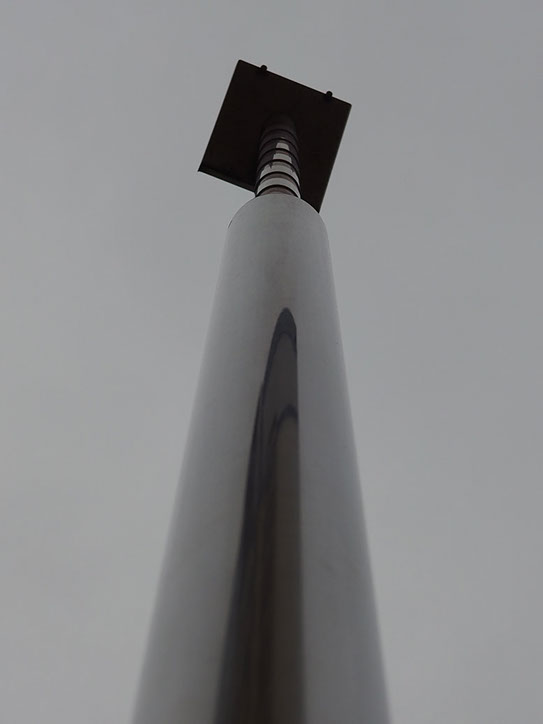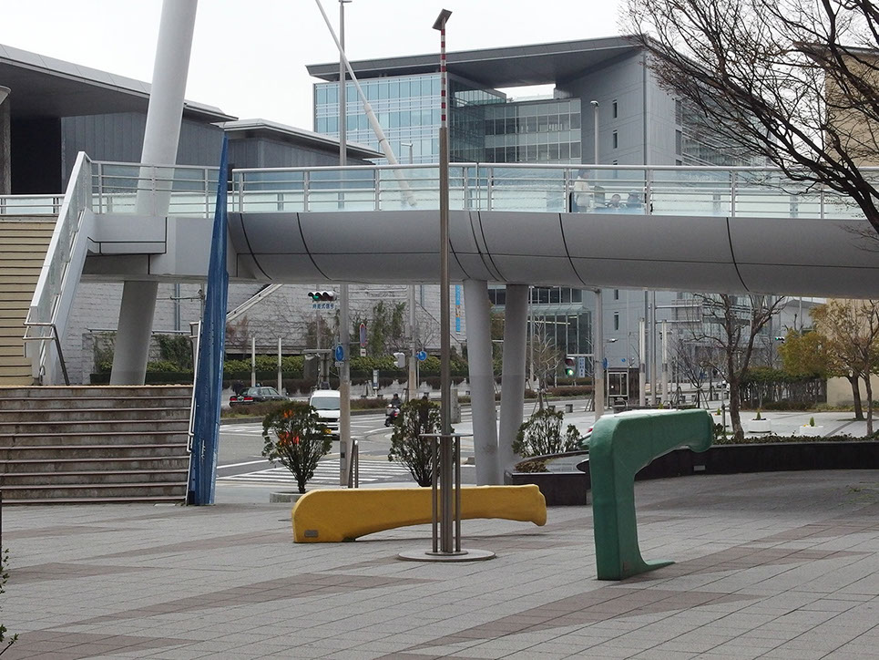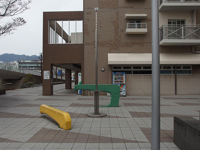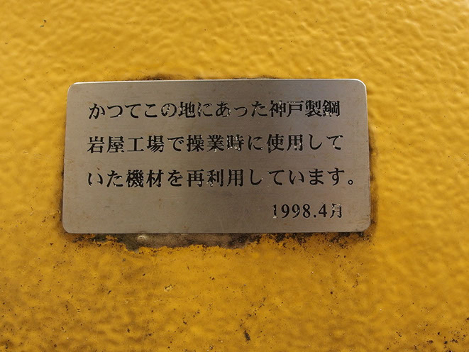 このポールの廻りには、神戸製鋼の工場廃材でアーム状のフックを二つベンチとして配置してある。そして、この作品の成立ちから広く大きな宇宙へと思いを巡らすことのきっかけになればと思う。