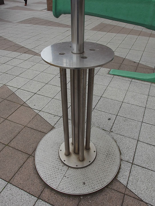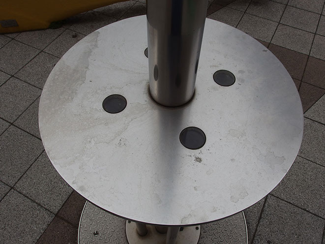 この作品は、地下水位計そのものである。即ち、井戸の上に被せるかたちで、テーブルとその中心を貫くポール=水位計を配置した構造だ。ポールの上部の赤いストライプは、目盛になっている。また、下のテーブル状の板の小さな覗き窓からは、井戸の中、地下水の水面を覗くことが出来る。その水面をみせるために、ポール先端に太陽電池が取り付けてあり、昼間は白色のLEDの光で照らし、夕暮れから数時間は、スーパーキャパシタという蓄電素子に蓄えた電力で、緑色の光をゆっくりとした呼吸と同じぐらいの周期で点減させている。このポールの廻りには、神戸製鋼の工場で使われてきた重厚な設備廃材で、アーム状のフック二つをベンチとして配置してある。そもそも、再開発されたこの土地は、大工場の一角 であったわけだ。