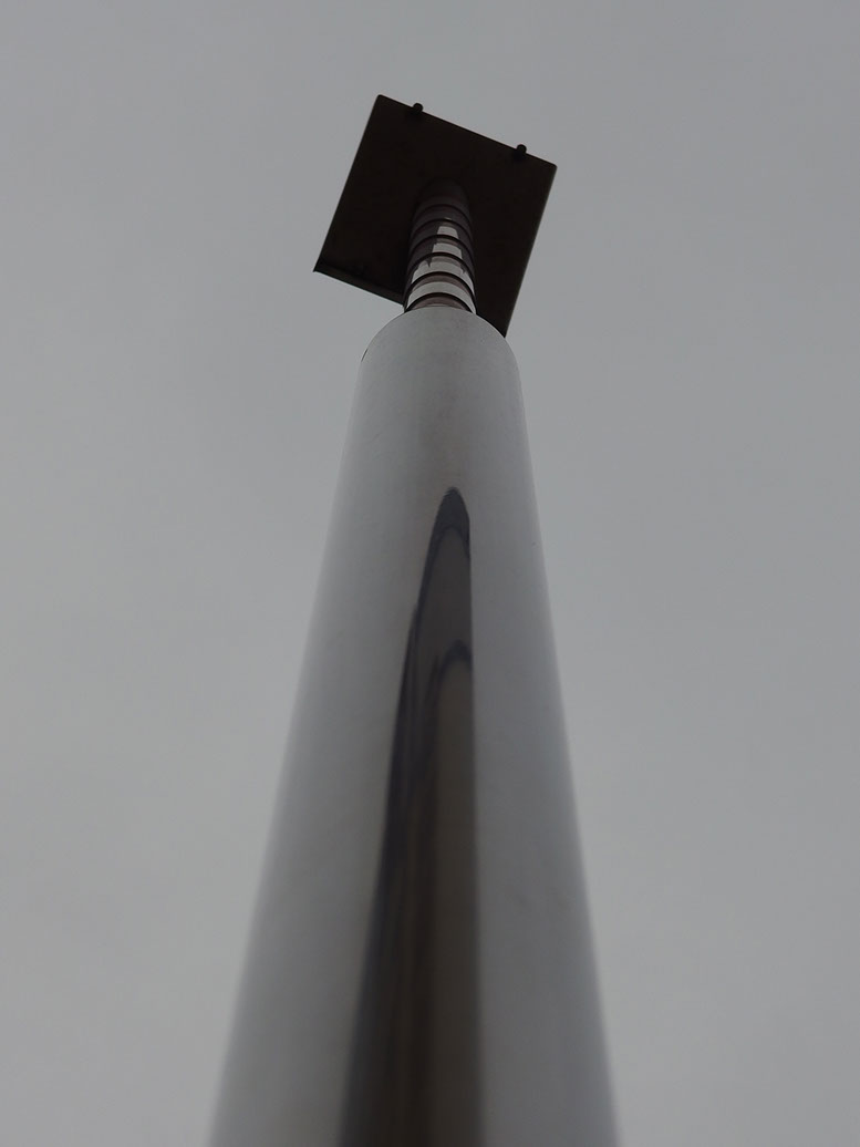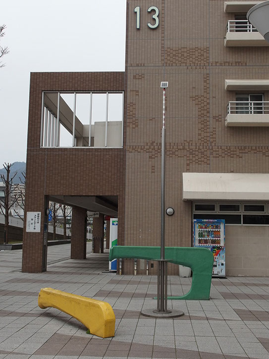 コンクリートやアスファルトといった都市の皮膚の下には、土や砂があり、それ程深くないところに地下水がある。ここ「HAT神戸・灘の浜」においては、海が近いこともあって潮の干満による潮位の変化も表層地下水に対して影響をおよぼすはずである。これは、地球と月と太陽との関係がもたらす変化である。この作品は、地下水位計そのものでもありポールの上部のストライプは、目盛に成っている。また、下のテーブル状の板の小さな覗き窓からは、地下水の水面を覗くことが出来る。その水面をみせるために、ポール先端に太陽電池が取り付けてあり、昼間は白色のLEDの光で照らし、夕暮れから数時間は、緑色の光をゆっくりとした呼吸と同じぐらいの周期で点滅させている。