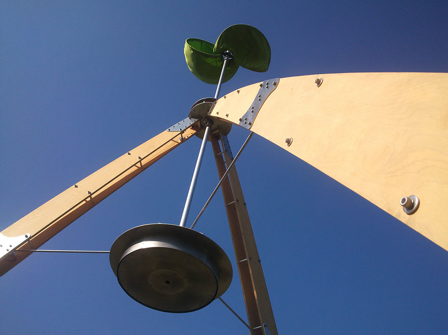 The windmill uses special plywood for the structure, and the sail is made of cloth. It is an assembly formula based on temporary installation and can be assembled in about 6 hours. The size is a wooden tripod part with a height of 5m, at the top of the sail 7.3m, the installation surface is an equilateral triangle with one side 4m.And, it has wind resistance performance exceeding wind speed of 24m/s. In addition, we have a mechanism to deliver sky video images by ustream with energy from solar panels.