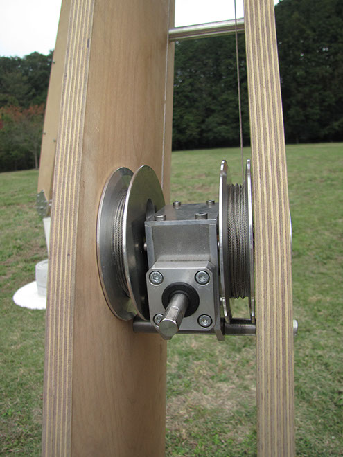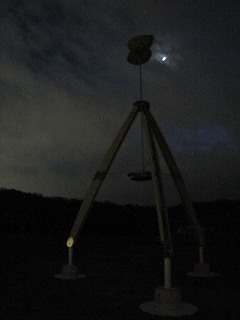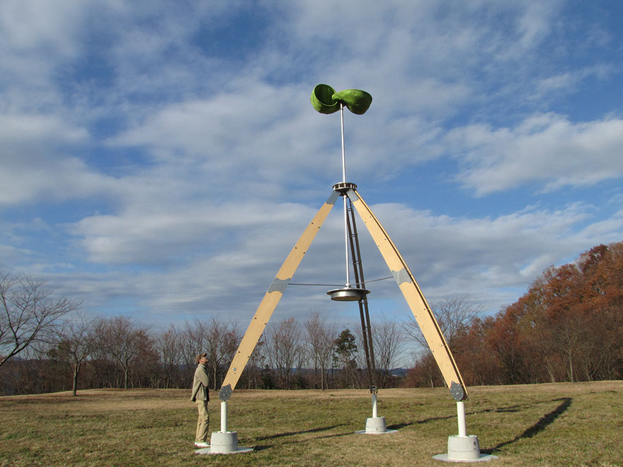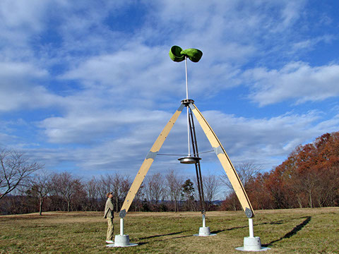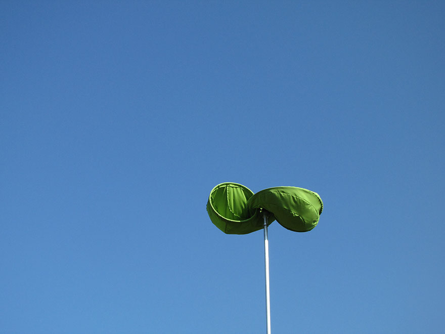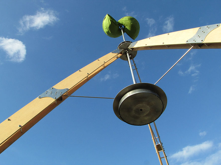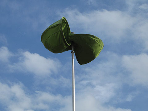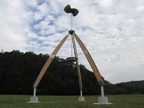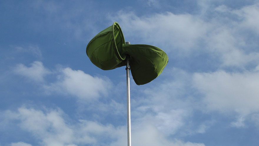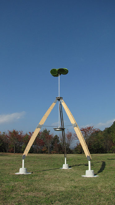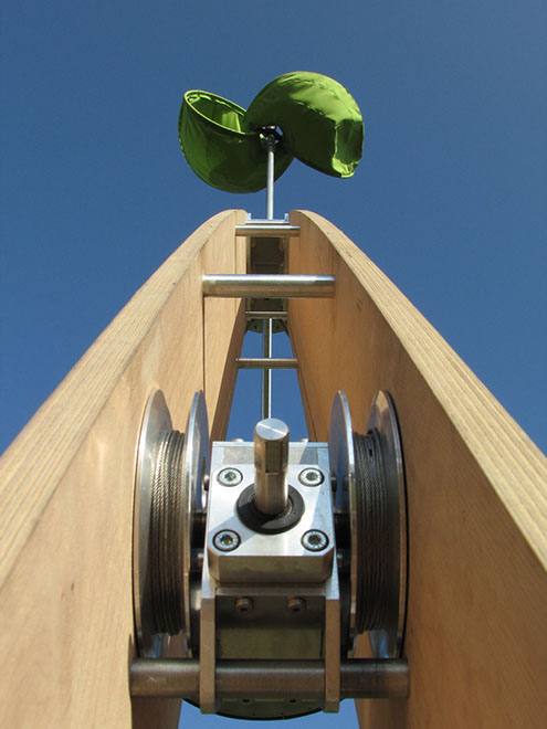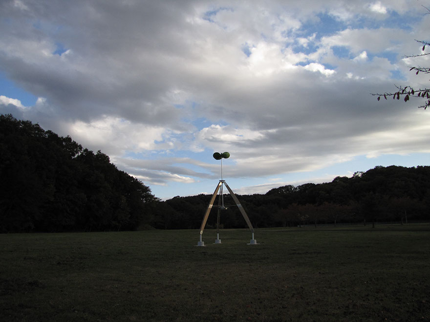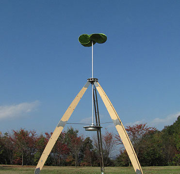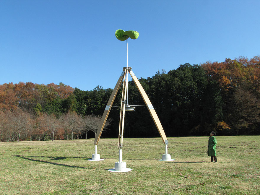 大きな木製の三脚構造体の上部に布製の風車がゆっくりと回る。様ざまな場所で、空を見るための仕掛け。