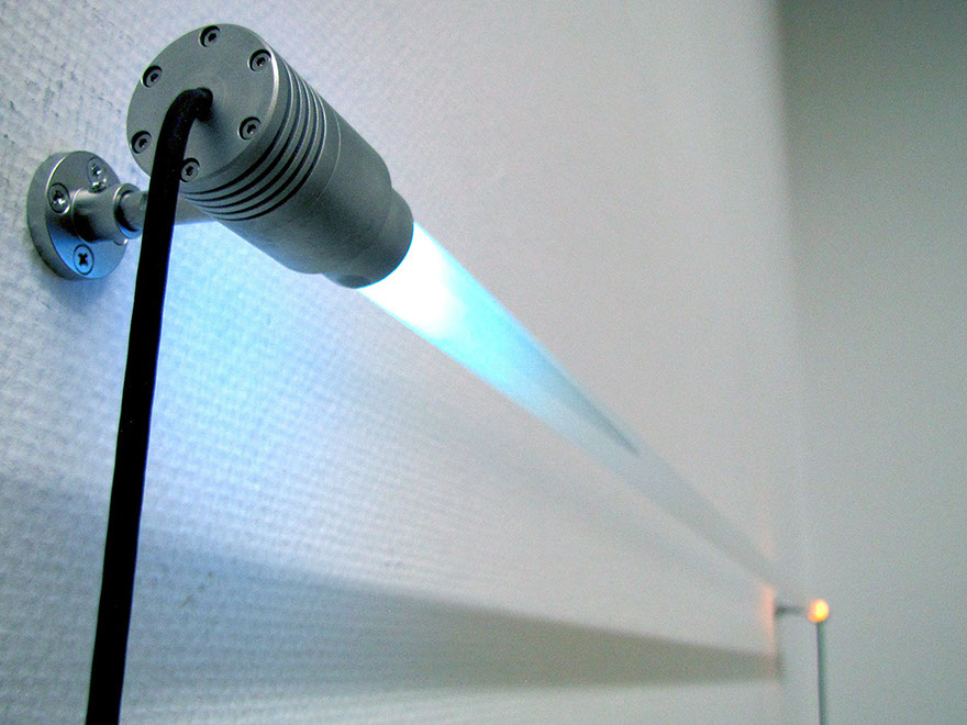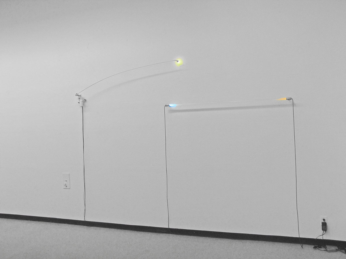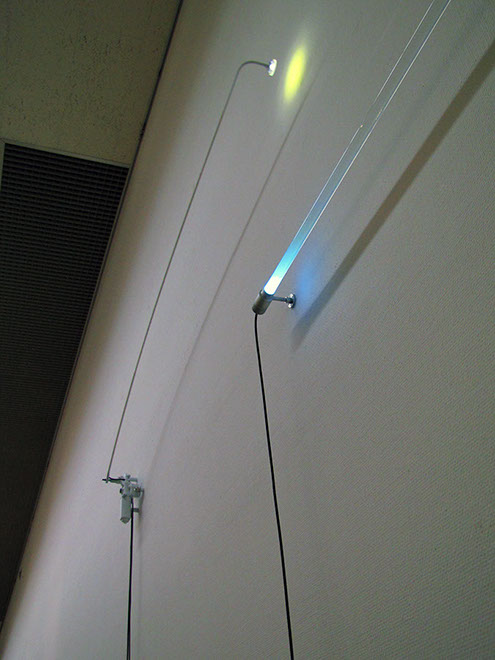 もうひとつは、液体が封入されたガラス管の両端にスカイブルーとサンセットオレンジの光がそれぞれ仕掛けてある。 / The other work is "the sky blue" and "sunset orange" lights are set at both ends of a glass tube filled with liquid, respectively.