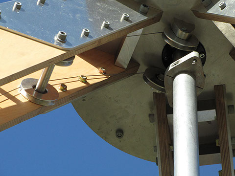 回転軸の下方の円盤には、ソーラー発電システム、WiFiを介してインターネットに映像をあげるシステム、映像を地面に向けて投影するシステムが搭載されています。 / On the disk under the axis is installed a solar power generation system, a system that sends live video to the Internet via WiFi, and a system that projects images toward the ground.