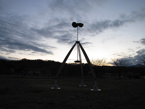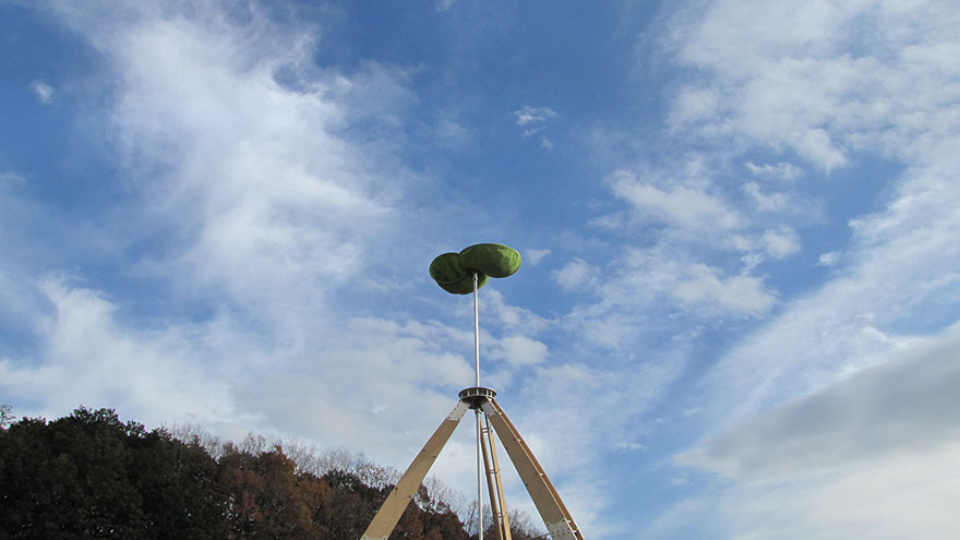 A cloth windmill slowly turns over the large wooden tripod structure. A mechanism to see the sky in various places. For all of you, I stand under this windmill and create a place to look up at the sky. From the summer of 2013 it was the third installation following Kosuge Village (Yamanashi), Nishi Shinjuku(Tokyo).
