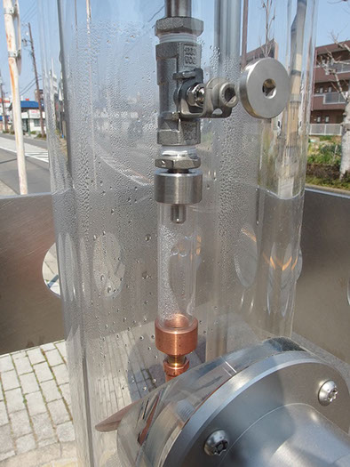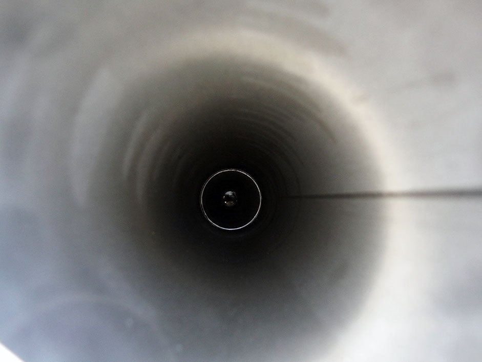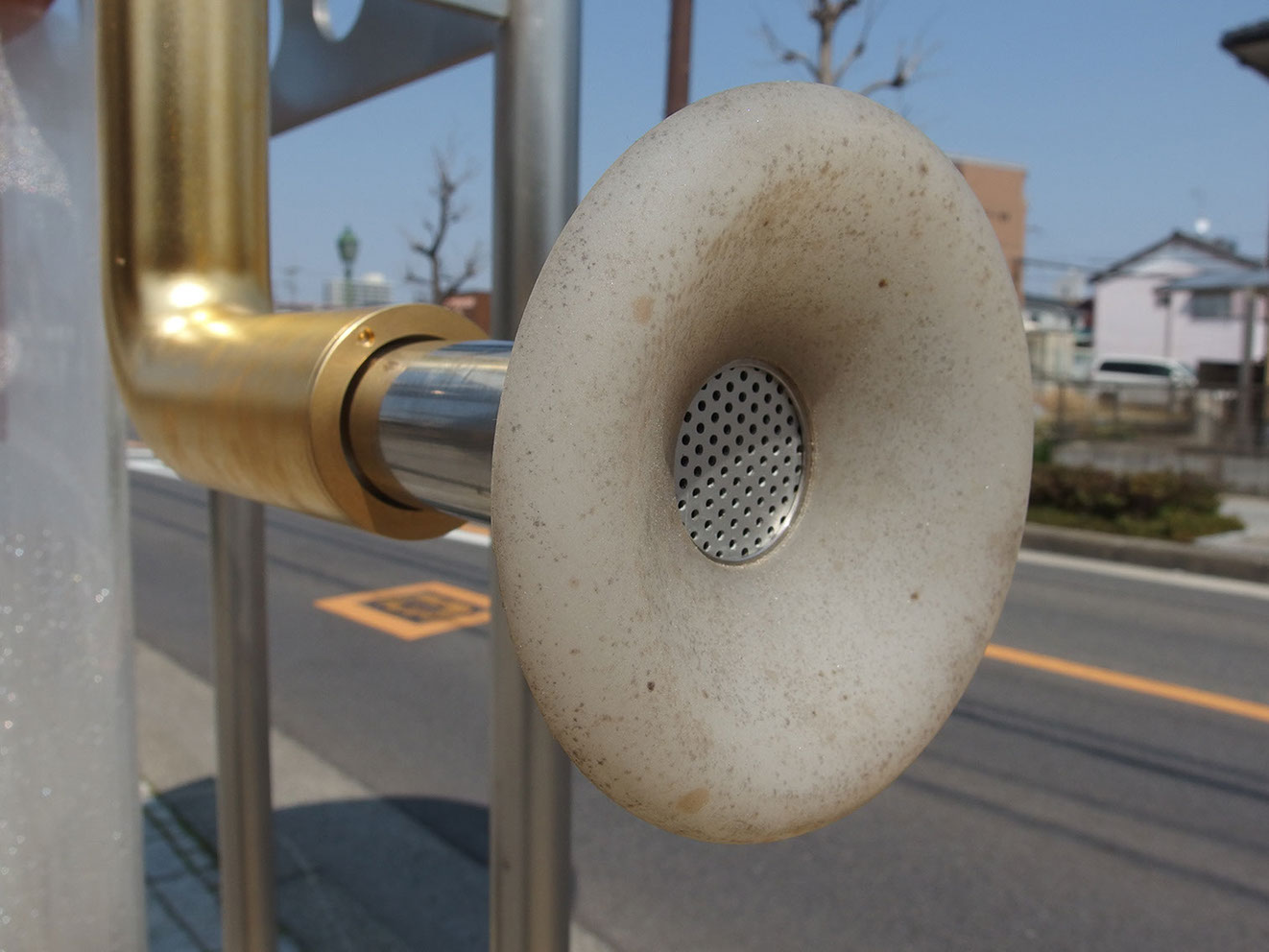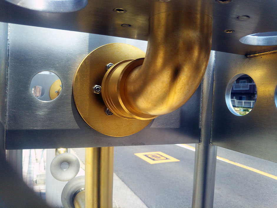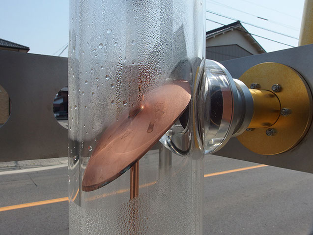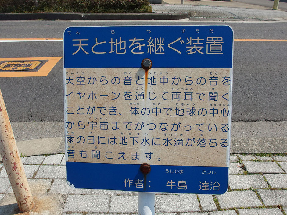 天に向けて設置されたパラボラ集音器の焦点から音を導くパイプと足もとに掘られた井戸の地下水面に向けられたパイプが、フレームで支持され、それぞれの開口端にはイヤーパッドが対向して取り付けてある。鑑賞者は、そこに左右の耳を挟み込むことで、上空と地球の中心を結ぶ線上に自らの知覚を挿入する事に成る。また、雨の日、パラボラは、雨水を集めることにもなり、その水が直接地下水面に滴下する為の仕組も持たせてある。主に聴覚を頼りに世界とつながる為の装置でもある。