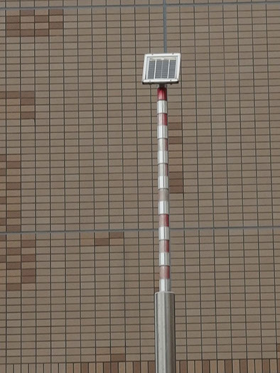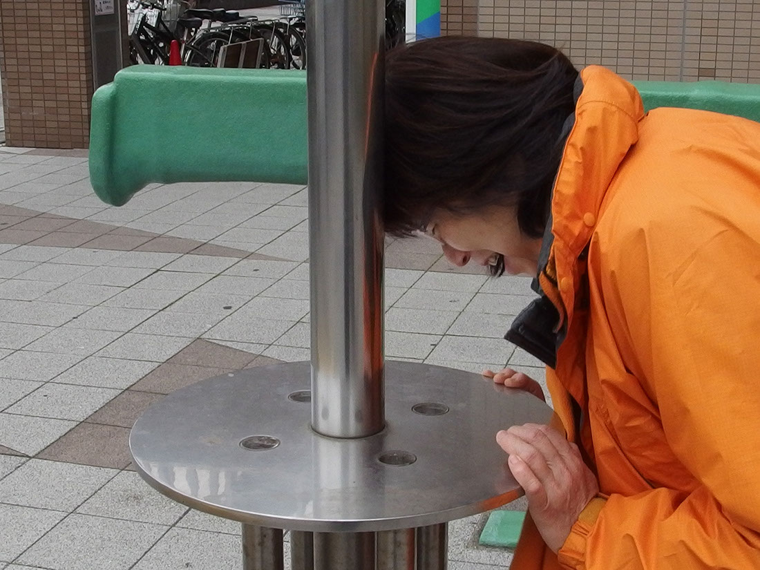 コンクリートやアスファルトといった都市の皮膚の下には、土や砂があり、それ程深くないところに地下水がある。ここ「HAT神戸・灘の浜」においては、海が近いこともあって潮の干満による潮位の変化も表層地下水に対して影響をおよぼすはずである。これは、地球と月と太陽との関係がもたらす変化である。この作品は、地下水位計そのものでもありポールの上部のストライプは、目盛に成っている。また、下のテーブル状の板の小さな覗き窓からは、地下水の水面を覗くことが出来る。その水面をみせるために、ポール先端に太陽電池が取り付けてあり、昼間は白色のLEDの光で照らし、夕暮れから数時間は、緑色の光をゆっくりとした呼吸と同じぐらいの周期で点滅させている。