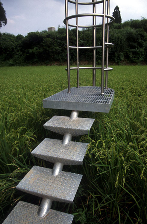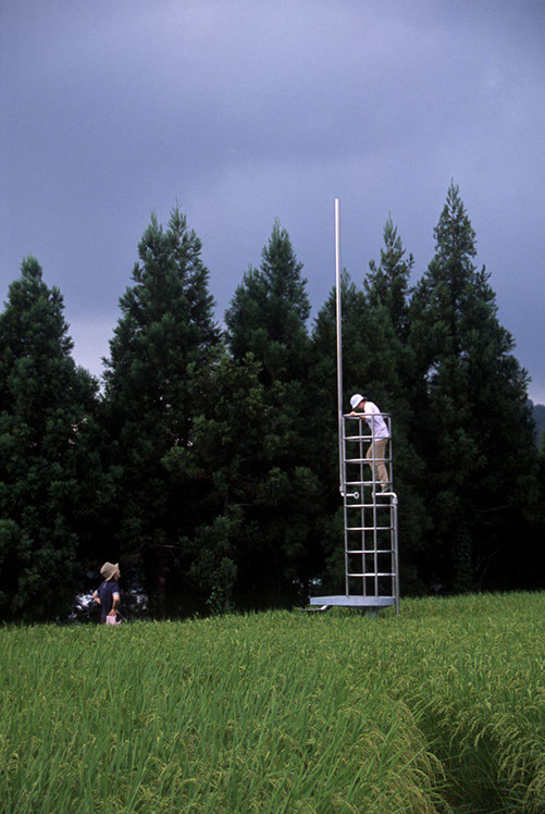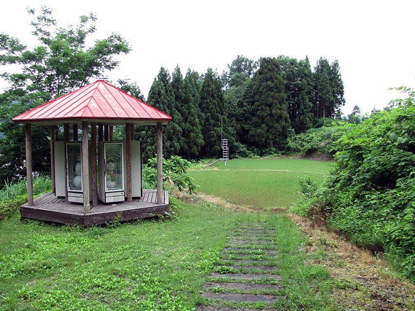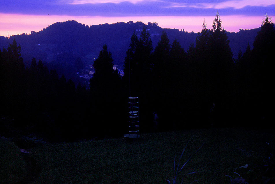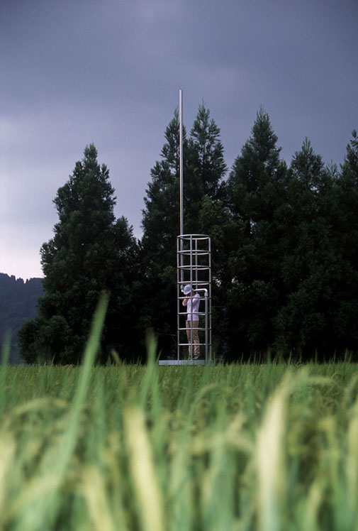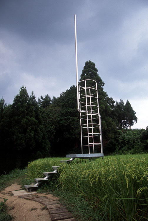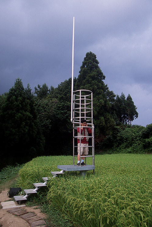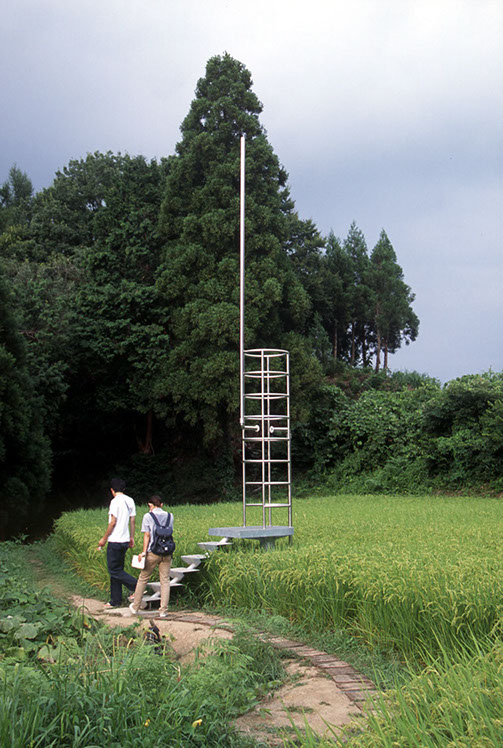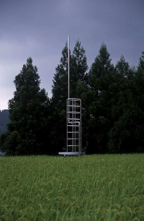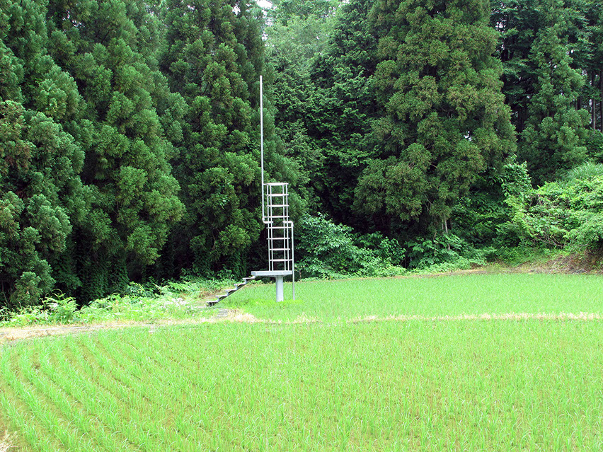 2000年の「第1回大地の芸術祭」において、松代町の棚田の風景の中に設置させていただいた。この作品は、私にとって文字どおり「観測所」である。この地との関わり始めに、妻有の棚田の中、自分のための物理的な一点としてこの「観測所」を置いてみた。今後もかかわりを持つこの地での観測によって、どの様な問いが生まれてくるのか、様々に思いをはせながらの第一歩であった。